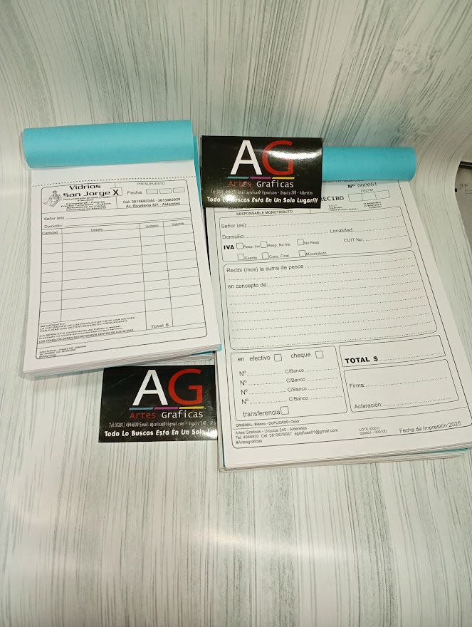 Talonario compuesto por 50 hojas por duplicado; original en papel obra blanco de 75g, duplicado en papel color de 75g, impresos en negro. Troquelado y abrochado por la parte superior o el lateral izquierdo de acuerdo a tu preferencia.