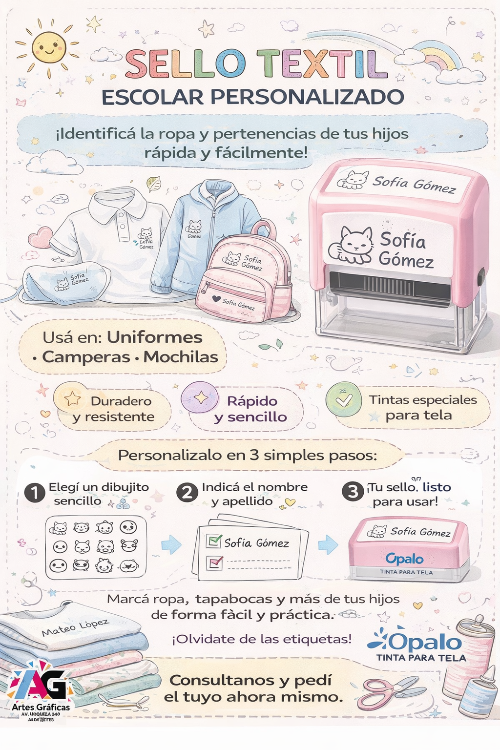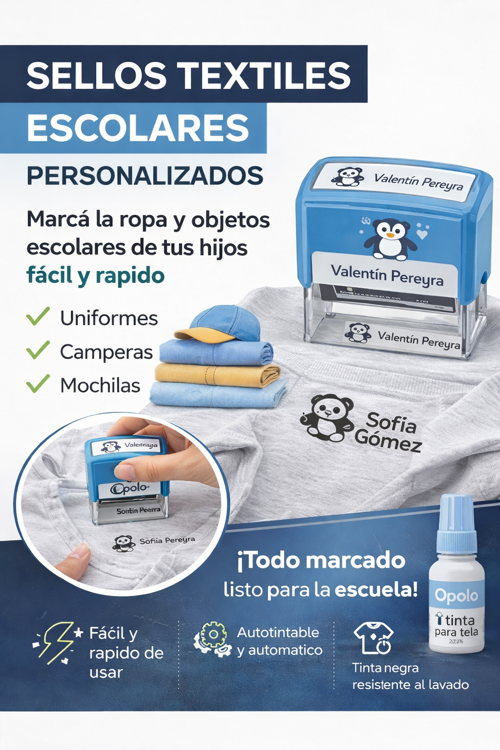 El Sello Textil Escolar Personalizado es la herramienta perfecta para padres que desean identificar de manera clara y práctica las prendas y objetos escolares de sus hijos. Este sello permite incluir un diseño sencillo (un dibujo) junto con el nombre y apellido en un formato de dos líneas de texto, ideal para etiquetar uniformes, camperas, mochilas y otros artículos esenciales. Gracias a su sistema automático y autotintable, el sello proporciona un uso rápido y sin complicaciones, asegurando un acabado preciso, resistente y fácil de aplicar.