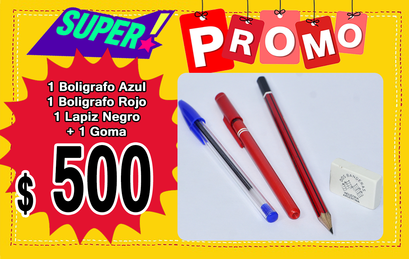 SUPER PROMO KIT DE UTILES INCLUYE BOLIGRAFO AZUL, ROJO LAPIZ NEGRO Y GOMA
